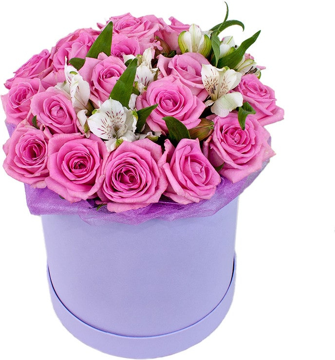 21 розовая роза, 3 альстромерии, зелень, оазис, коробка, лента27 розовая роза, 4 альстромерии, зелень, оазис, коробка, лента